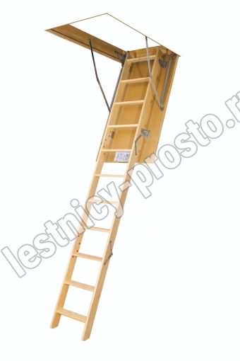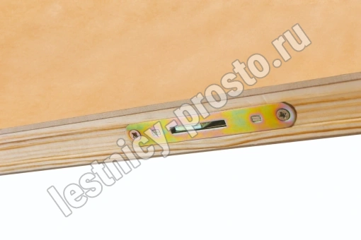 Деревянная чердачная лестница LWS изготовлена из древесины сосны и укомплектована утепленной крышкой, облицованной ДВП бежевого цвета (толщина крышки люка с утеплителем – 36 мм). Крышка люка крепится металлическими шарнирами, которые позволяют регулировать длину лестницы (макс. 40 мм). Для транспортировки лестница снижается в пазах, перед использованием необходимо отодвинуть лестничный марш от плиты люка.