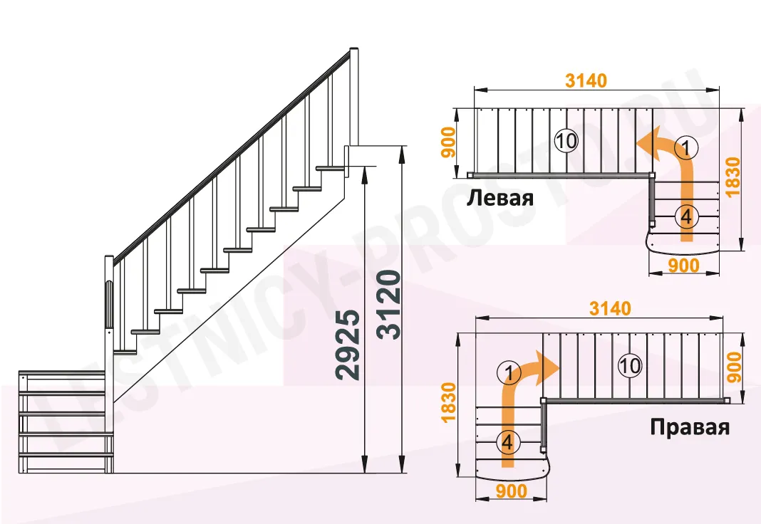 Лестница из сосны К-002М/1 с подступёнками под покраску |