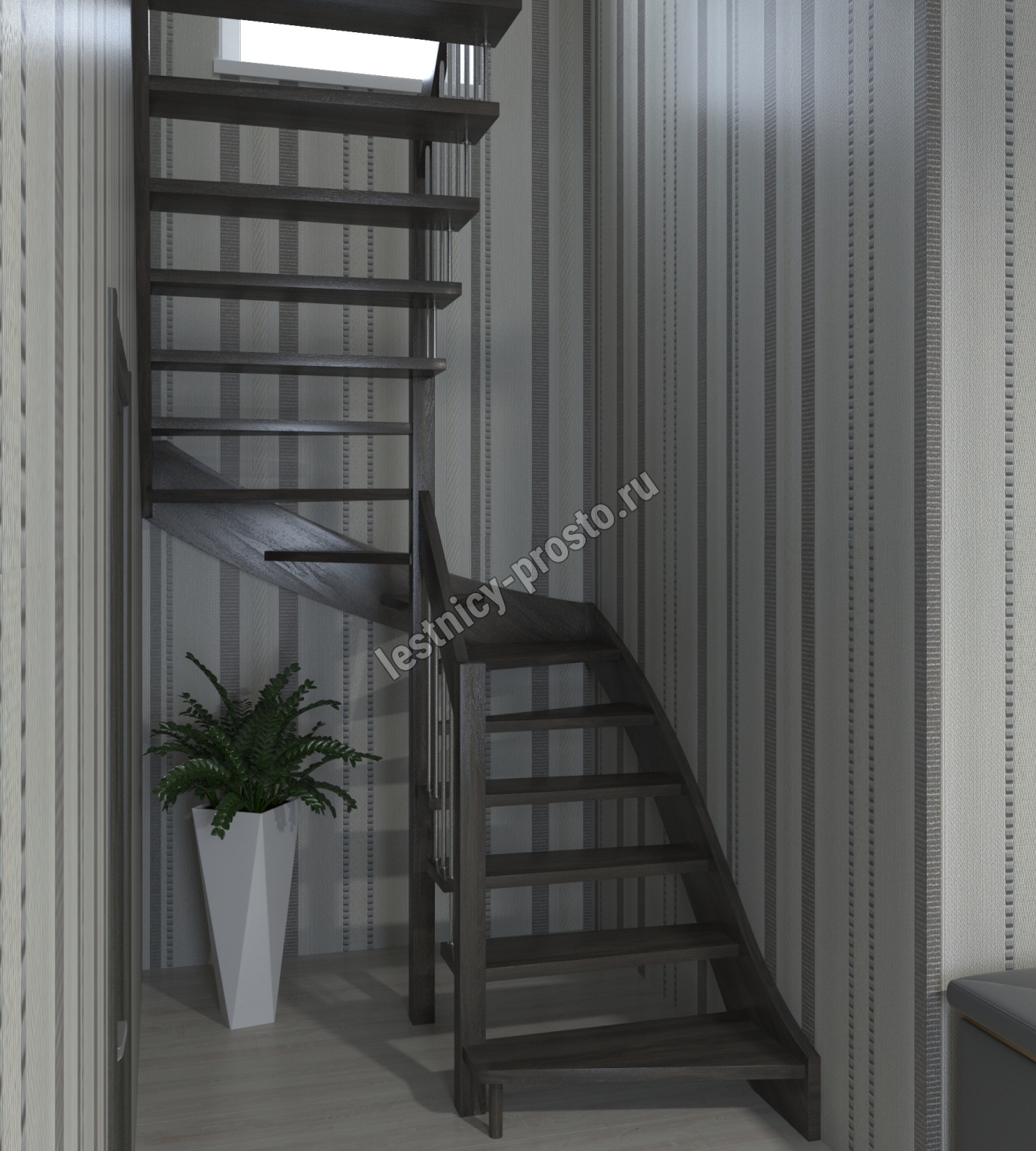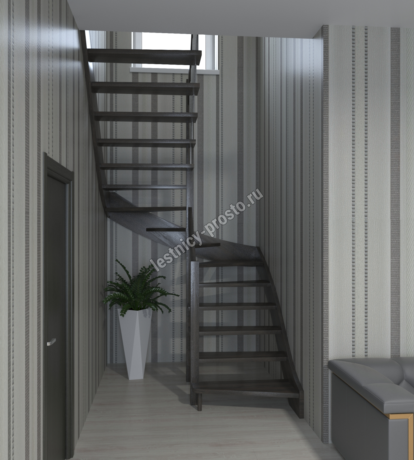 Вид лестницы по реализации поворота: с поворотом на 90° через площадку, с поворотом на 90° через 4 забежные ступени;