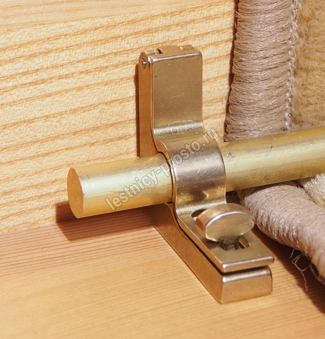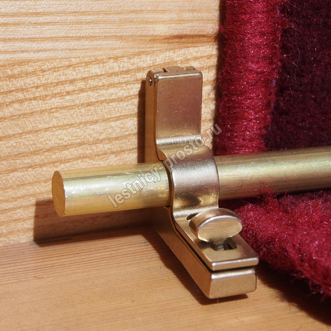 Ковродержатель комплектуется двумя держателями из латуни цвета золото, а также цельным прутком из латуни длиной от 251 до 300 см. Конструкция является сборно-разборной не требующей демонтажа креплений, что делает ее долговечной и очень удобной для чистки ковров и ковровых покрытий.