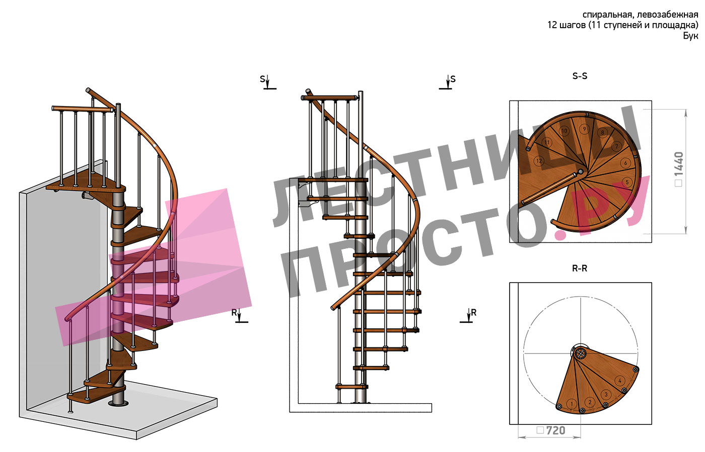 Винтовая лестница Prosto Spiral Black D140см, h260.5-304.6 см, бук