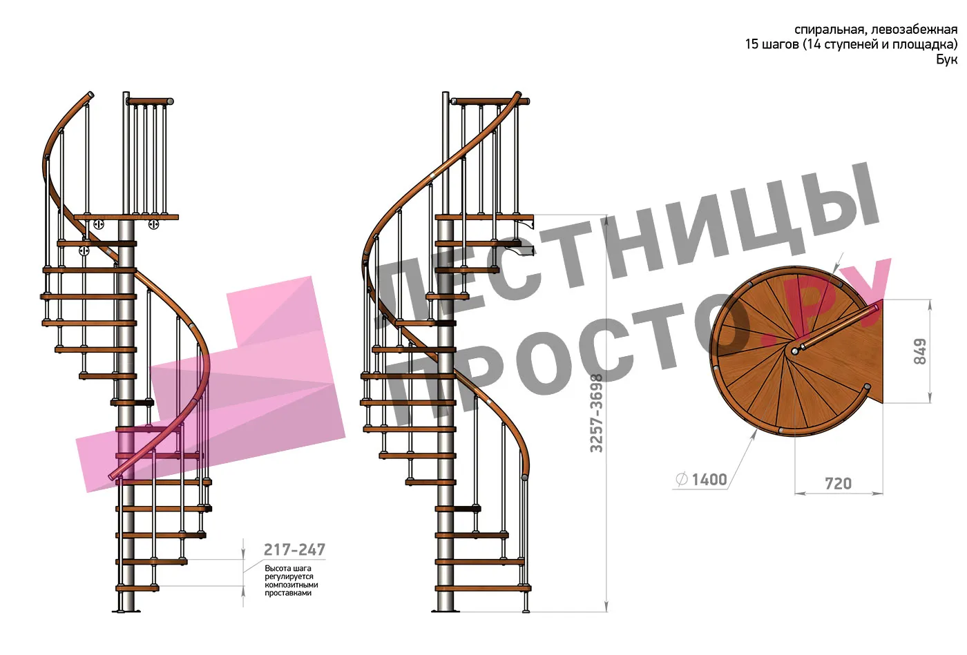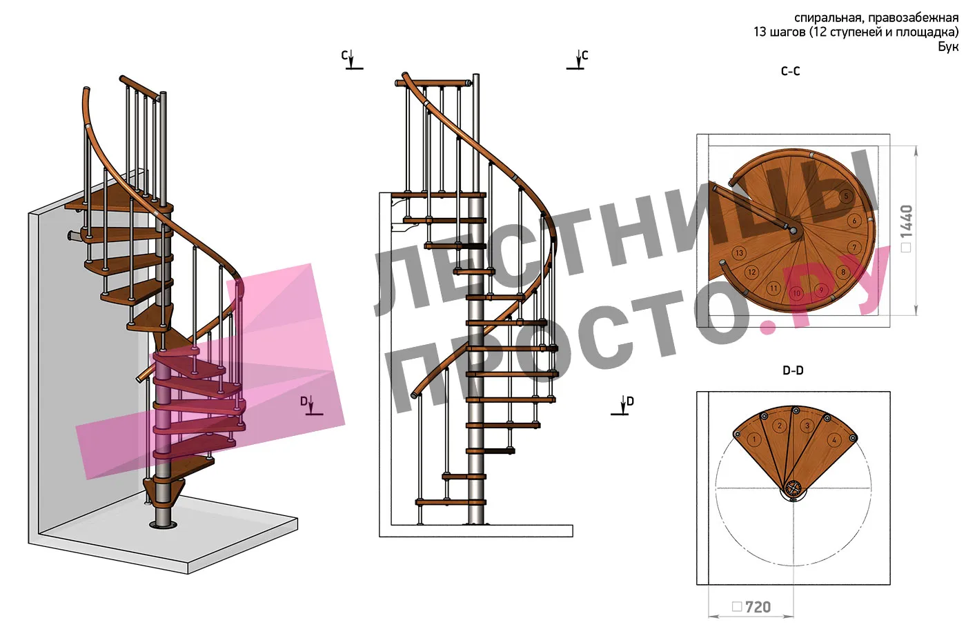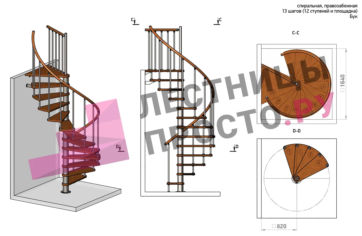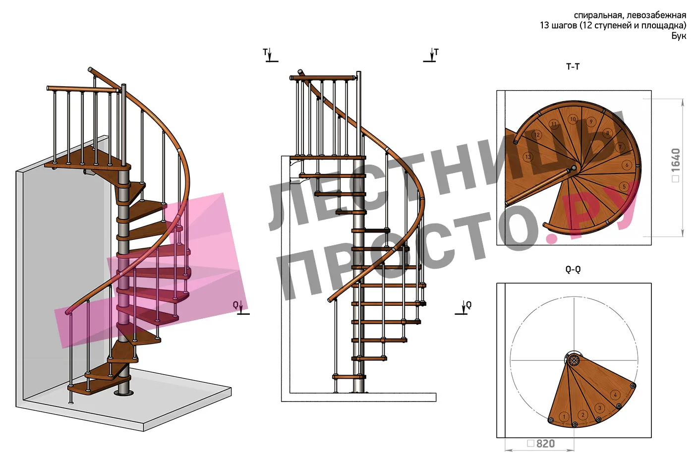 | Винтовая лестница Prosto Spiral Black D140см, h282.2-326,3 см, бук |