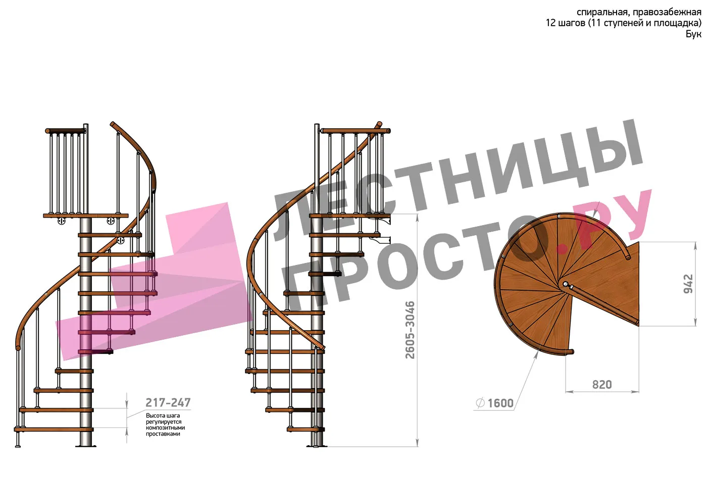 | Винтовая лестница Prosto Spiral Black D160см, h260.5-304.6 см, бук |