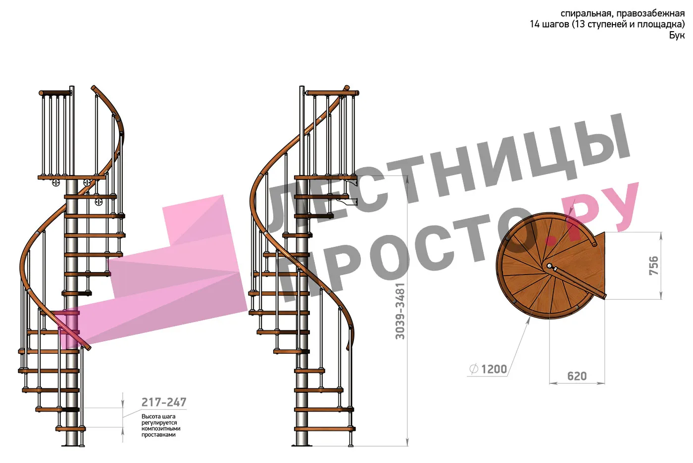 | Винтовая лестница Prosto Spiral Black D140см, h303.9-348,1 см, бук |