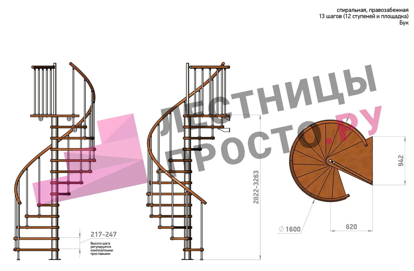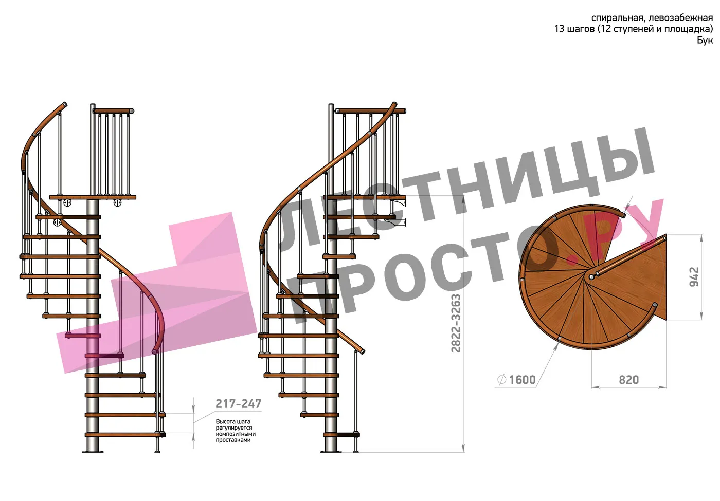 | Винтовая лестница Prosto Spiral Black D160см, h282.2-326,3 см, бук |